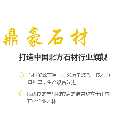 青島鼎豪石材有限公司坐落于聞名遐邇的膠東半島大澤山北麓,我司石材資源豐富,開采歷史悠久,技術力量雄厚,生產設備先進,以優良的產品和較高的信譽屹立于山東石材企業之林。